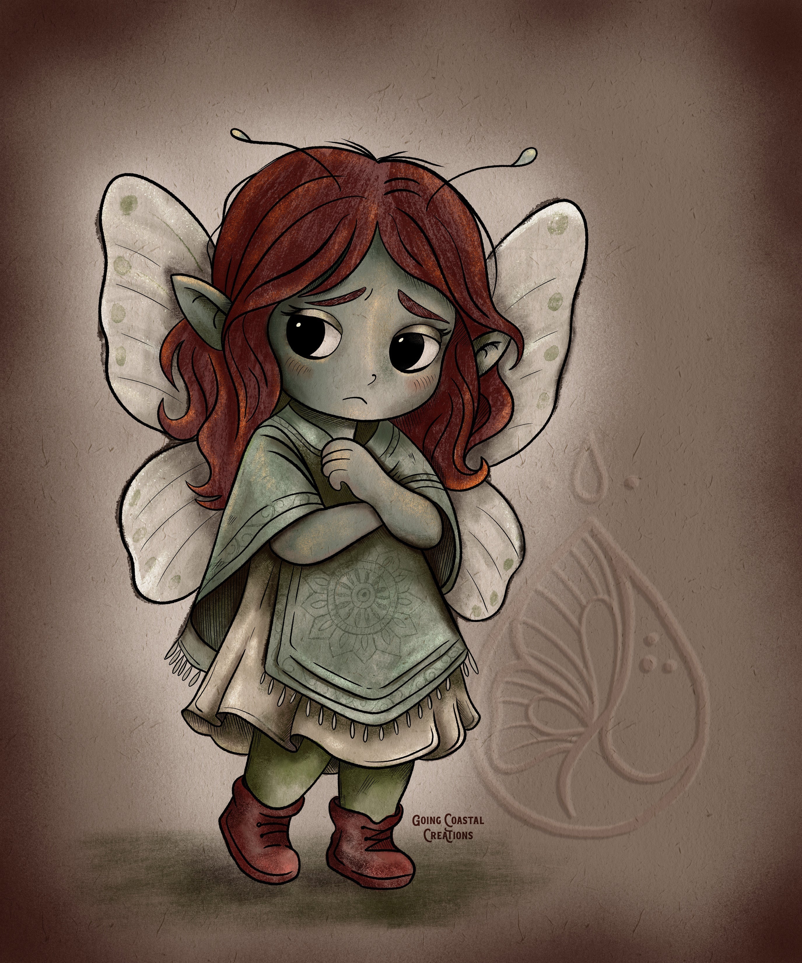 She does not arrive - she appears. Already seated, already small. Wings wrapped so tightly around her frame they seem like part of her clothing, not something meant for flight. I almost mistook her for a Nestling at first - until she looked up. Her eyes are oceans of withheld expression. The kind that measure a room before daring to speak. She offers help before names, gifts before connection, apologies before mistakes. Nervina is a creature shaped by vigilance - not out of fear of danger, but fear of being 'too much' to keep. She keeps herself folded, muted, useful. I believe her wings are stunning beneath that dull cloak, but she will not show them. Not yet. Maybe never. I suspect they shimmer like hidden grief - beautiful, but painful in the light.