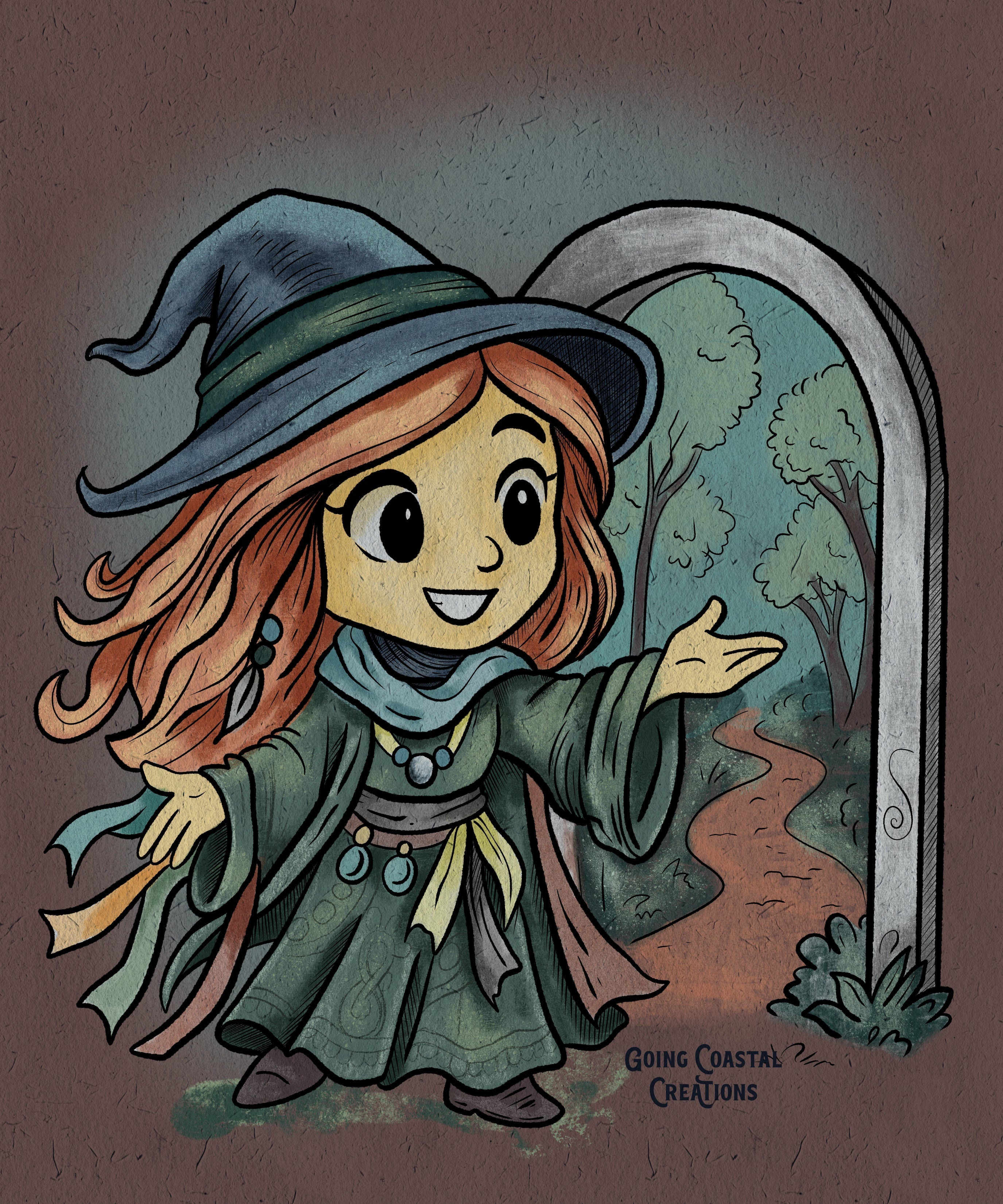 Appearance:Flowing skirts, layered scarves, a tall hat that shifts with the wind. Her cloak is threaded with trinkets: bits of broken jewelry, tiny bells, faded feathers, ribbon fragments from a dozen forgotten celebrations. Each one once belonged to someone she helped walk away. Her portal hums - a mirror, a doorway, a shimmer between trees. It's never the same shape twice.